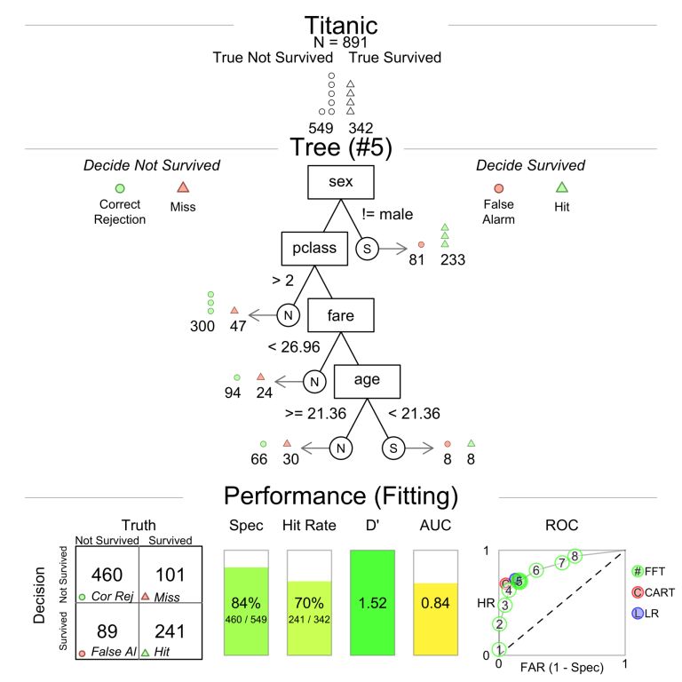 fftitanic[1] "An FFTrees object containing 8 trees using 4 predictors {sex,pclass,fare,age}"[1] "FFTrees AUC: (Train = 0.84, Test = --)"[1] "My favorite training tree is #5, here is how it performed:" trainn 891.00p(Correct) 0.79Hit Rate (HR) 0.70False Alarm Rate (FAR) 0.16d-prime 1.52