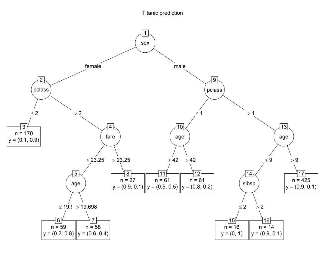 plot(partyTitanic, main = "Titanic prediction", type = "simple", inner_panel = node_inner(partyTitanic, pval = FALSE), terminal_panel = node_terminal(partyTitanic, abbreviate = TRUE, digits = 1, fill = "white"))