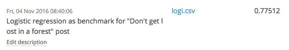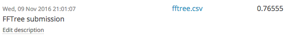 结果是74.6%,比bagging要好不少(译者注:这里的比较不是很公平,因为之前bagging只用了500棵树,而这里随机森林用了5000棵树,感兴趣的读者可以试下统一数量后再做比较),但还是比逻辑回归差一点。