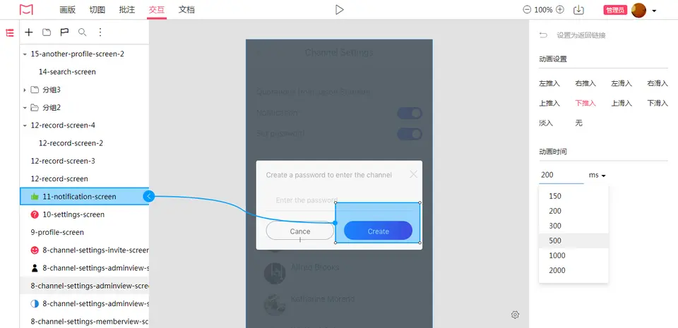 而为解决设计师这方面的烦恼,摹客添加了简单易操作的交互设计模块。设计师简单拖拽,即可为各类文本,按钮和界面部件添加交互。9种交互动画,帮助设计师更加生动直观的展示设计流程。