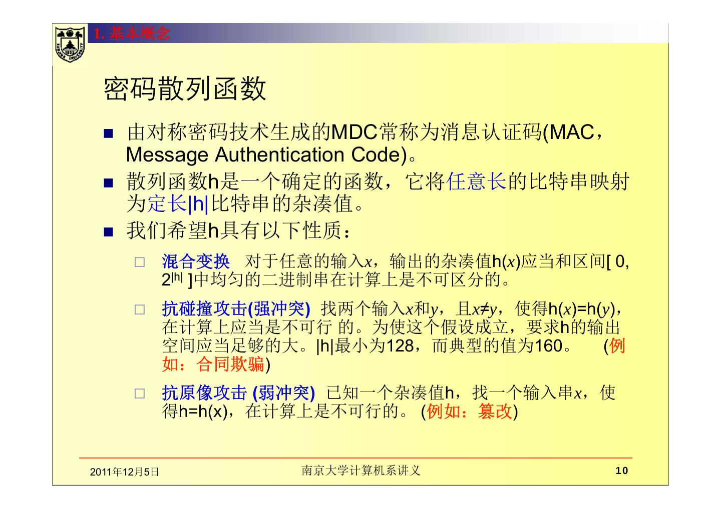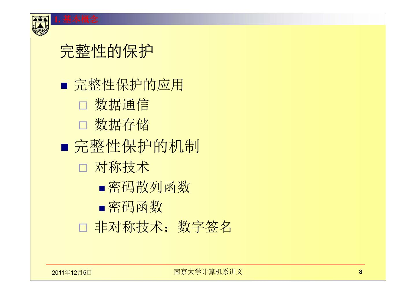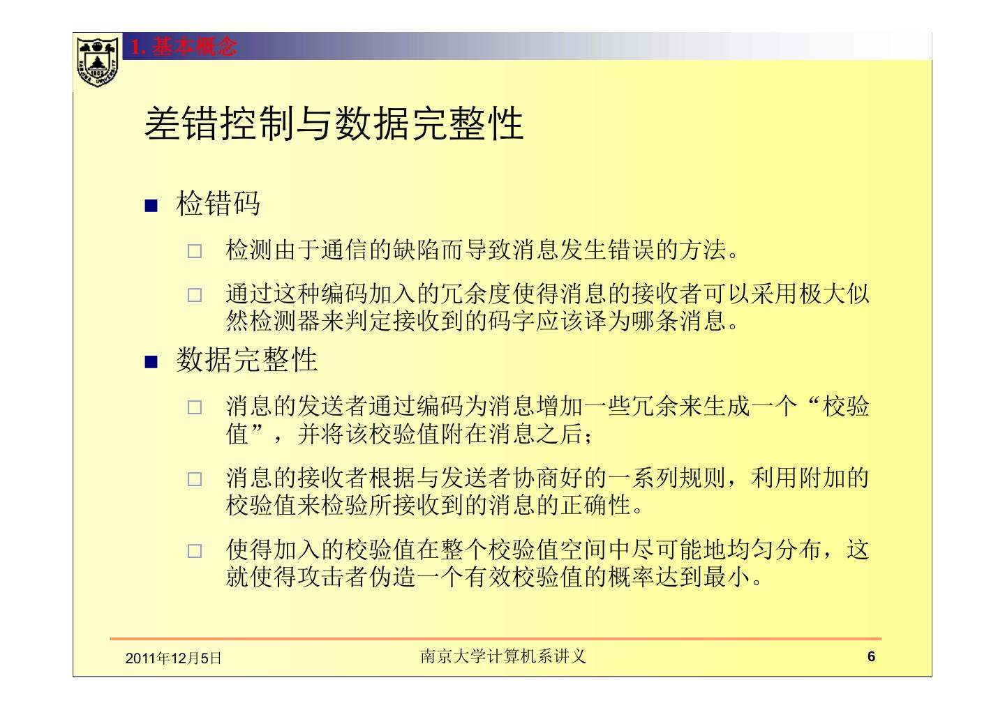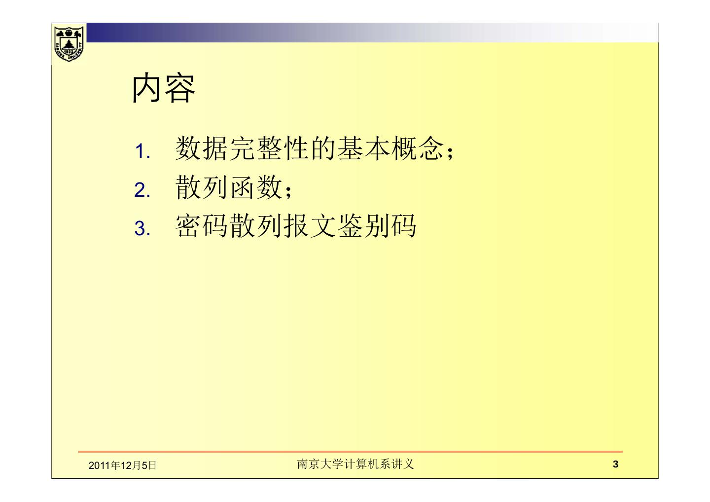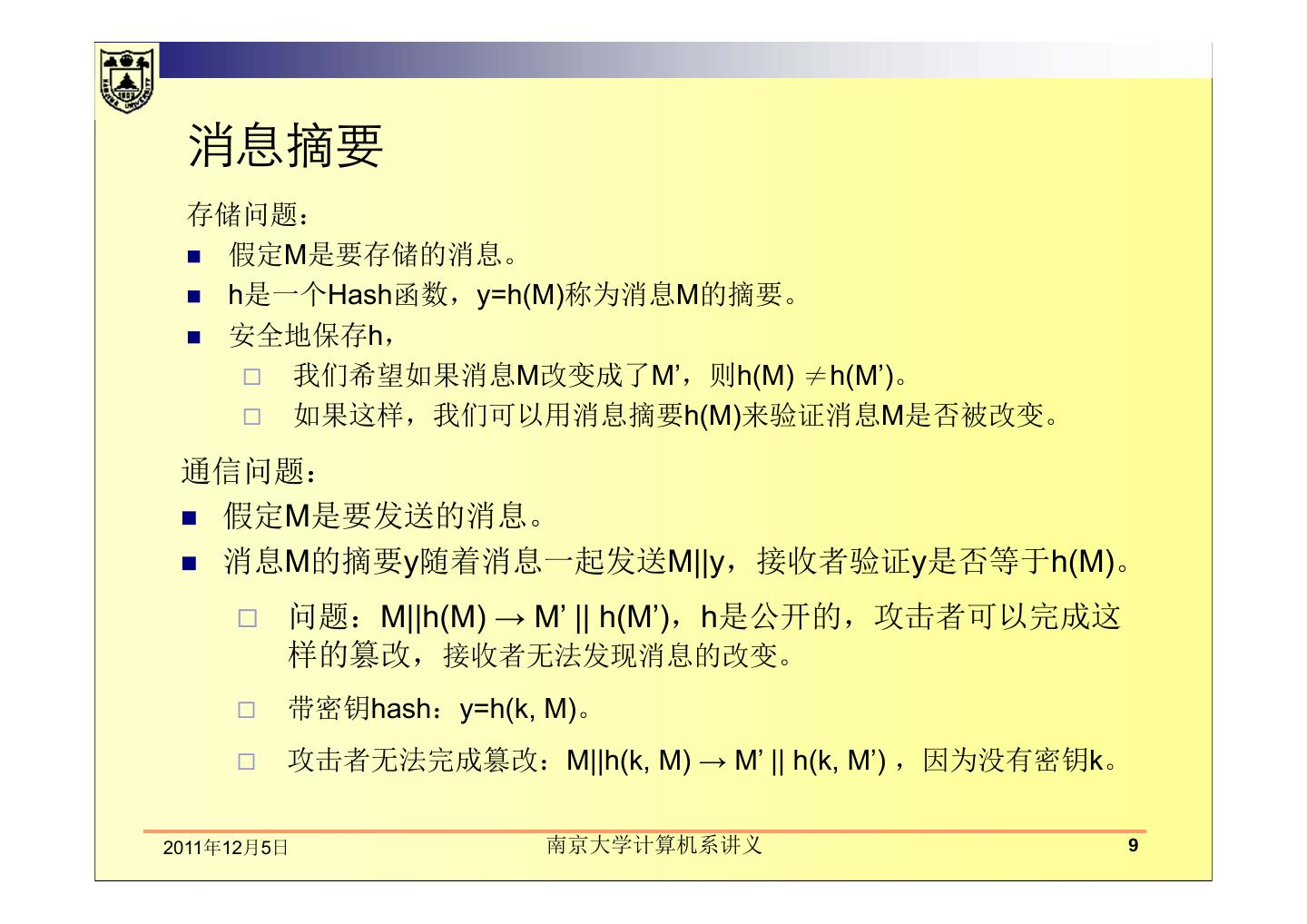 本章讲述在通信中数据的完整性、散列函数。主要包括数据完整性的基本概念及保护机制,如密码散列函数和数字签名的应用;介绍了散列函数及散列函数的密码分析;MD5报文摘要算法;密码散列报文鉴别码(HMAC)。