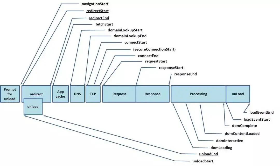 这是 navigation timing 监测指标图,从图中我们可以看出,浏览器在得到用户请求之后,经历了下面这些阶段:重定向→拉取缓存→DNS 查询→建立 TCP 链接→发起请求→接收响应→处理 HTML 元素→元素加载完成。不着急,我们对其中的细节一步步展开讨论。