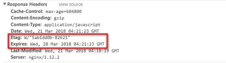 打开我们的网站,在 chrome devtools 的 network 面板中观察我们的请求资源,如果在响应头部看见 Etag 和 Expires 字段,就说明我们的缓存配置成功了。
