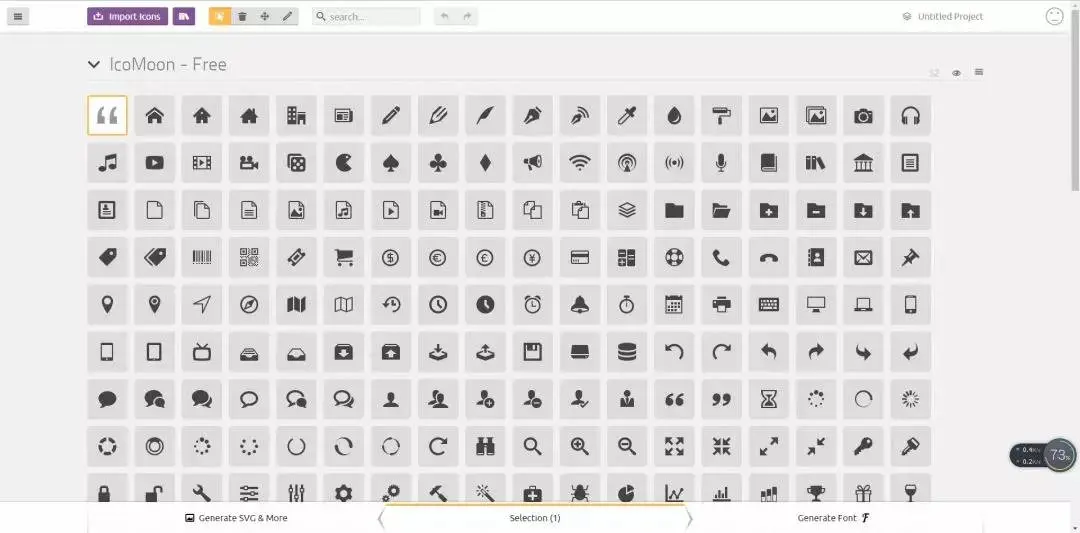 我们可以点击 Import Icons 按钮导入我们本地的 SVG 资源,然后选中他们,接下来生成 CSS 的事情,就交给 icomoon 吧,具体的操作,就和阿里矢量图标库类同了。