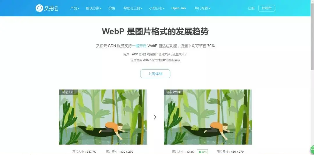 我们可以使用官网提供的 Linux 命令行工具对项目中的图片进行 WebP 编码,也可以使用我们的线上服务,这里我推荐叉拍云(网址:https://www.upyun.com/webp)。但是在实际的上线工作中,我们还是得编写 Shell 脚本用命令行工具进行自动化编译,测试阶段用线上服务方便快捷。(图片来自叉拍云官网)
