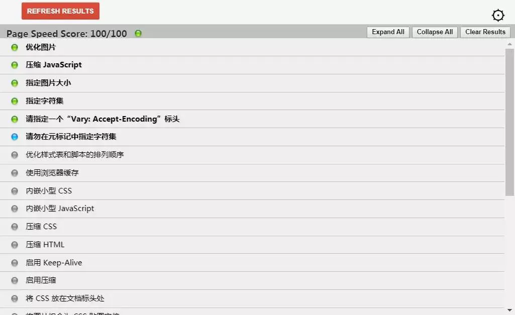 Page Speed 最人性化的地方,便是它会对测试网站的性能瓶颈提出完整的建议,我们可以根据它的提示进行优化工作。这里我的网站已经优化到最好指标了 (•́⌄•́๑)૭✧,Page Speed Score 表示你的性能测试得分,100/100 表示已经没有需要优化的地方。