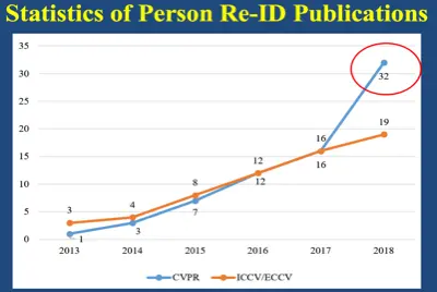 行人再识别具有广阔的应用前景,包括行人检索、行人跟踪、街头事件检测,行人动作行为分析等等。当然这个动作行为分析也包括用户在商场中的购物行为分析,比如估计顾客的年龄、性别、对什么样的商品感兴趣、停留的时间等等。这些信息有助于商场去策划相应的销售策略。由于行人再识别任务的重要性,近些年越来越多的研究人员和机构都投入进来,从计算机视觉顶会的论文发表情况就可以看出来这一趋势。例如在 2013 年,相关的文章在视觉顶会上发表的并不多,但是近年快速上升,在今年的计算机视觉顶级会议 CVPR 上,就有 32 篇文章发表,在 ECCV 上有 19 篇文章发表。