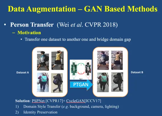 除了从构建更大更真实数据集的角度来应对大量训练数据需求的挑战,我们还可以通过数据生成的方法,来增加训练数据量。数据生成有传统方法和深度学习方法。比如说对图像进行一些操作像翻反转、剪裁、构建金字塔输入等,这些都是被广泛采用的传统方法。近年来,深度学习的方法主要是 GAN-based 方法。生成对抗网络(GAN)在行人再识别上的第一个工作发表在 ICCV2017 上,作者他用 DCGAN 生成没有标注的行人数据,来进行数据增强。这个工作的但问题是,DCGAN 生成的行人图片质量是比较低的。针对训练集中行人姿态变化不够的情况,CVPR2018 上,上海交大的倪冰冰老师团队用条件 GAN 来生成具有不同姿态的行人图像,以丰富训练集中行人的姿态变化。只不过,同样的问题是生成的图像质量比较低。另外, CVPR2018 中有团队做相机风格的学习。比如说从第一个摄像头拍到的真实图像,转移到第六个摄像头相机下,或者是第六个相机的图像转移成具有第一个相机风格的图像。通过这种方式,我们的训练集就会更加均衡地囊括场景中各个相机的风格,在测试阶段具备更好的性能。