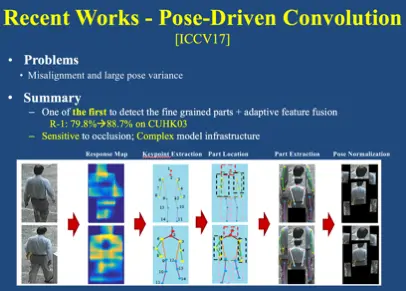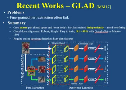 最后应对非理想场景的挑战,主要解决方案是对人体部件进行检测和匹配。我们在 ICCV2017 提出了 Pose-Driven Convolution (PDC) 方法来提取人体的细粒度部件,并进行矫正。但是由于需要提取非常精细的人体的部件, PDC 对遮挡以及人体关键点检测误差比较敏感。基于此,我们在 MM17 中提出了 Global-Local Alignment Descriptor(GLAD) 的方法,仅需提取三个粗粒度部件就能得到非常好的性能。
