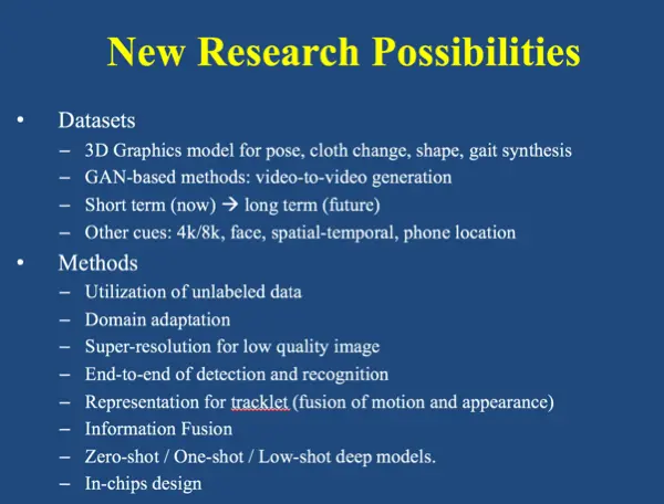 谈及行人再识别未来的方向,肯定离不开两个方面:数据和方法。在数据层面,一方面我们要构造更真实更大的数据集,另一方面也可以通过 3D Graphics 相关方法做数据生成。在方法层面,我们之前仅仅考虑视觉信息。其实现实世界中我们还可以获得大量其它信息加以利用,如 wi-fi 接入网络、步态 gait、GPSgps 等等。另外在现实应用中,行人检测和再识别其实是一体的, 应该在一个框架下统一优化。目前在这方面的工作还有所欠缺,未来我们会重点研究这一方向。