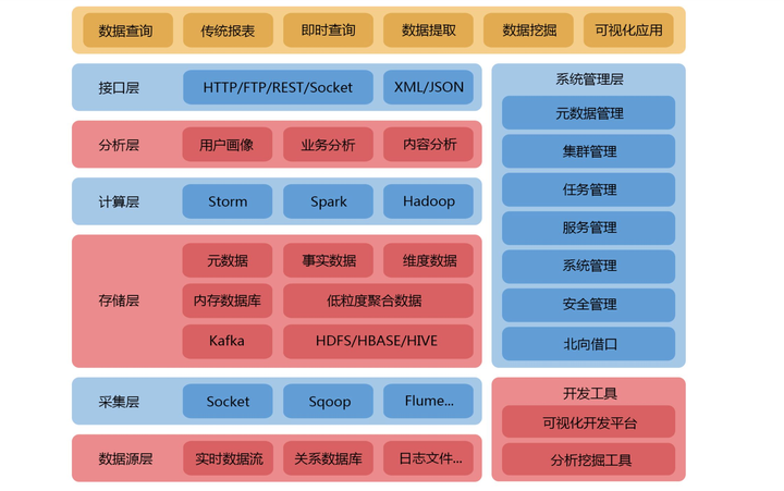 所谓架构模型,就是在企业中,数据从采集到呈现所要经过的基本流程以及流程涉及的相关技术;这方面涉及比较深的技术内容,笔者本身属于非技术出身,对于大数据相关技术,目前也仅停留在了解甚至听说阶段,在此不便做过多解释;
