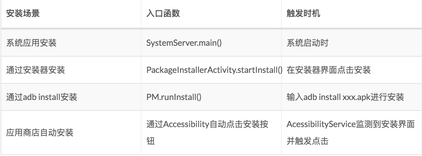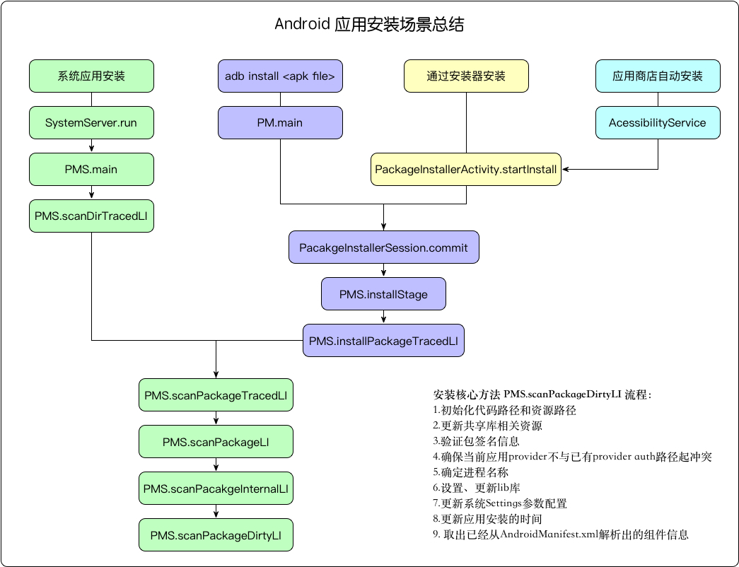所有的安装场景其实是殊途同归,最终调用到了PMS的scanPackageDirtyLI来实现安装功能,而所谓的安装,其实是对apk文件的解析、加载。