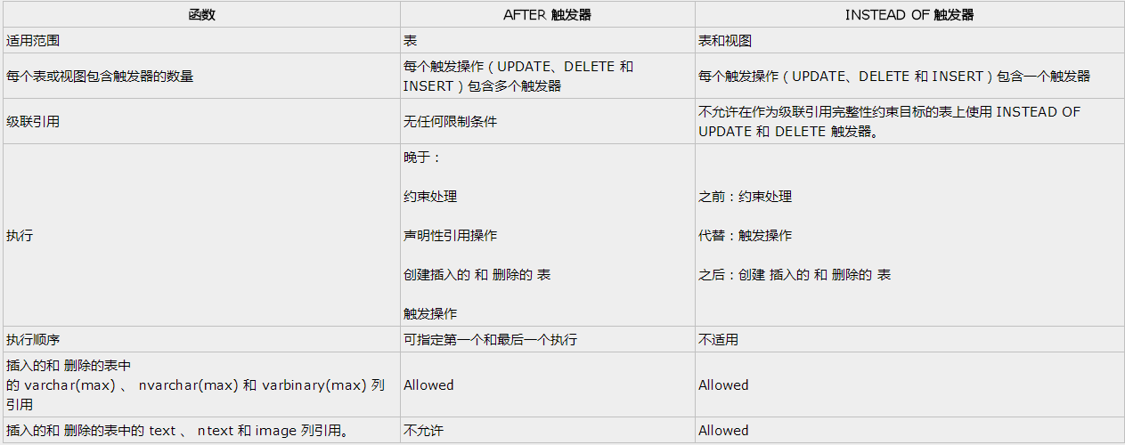 下表对 AFTER 触发器和 INSTEAD OF 触发器的功能进行了比较。