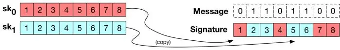 回想一下 Lamport 方法,要对一条 256 位的消息进行签名,我们需要一个包含 512 个独立密钥(和公钥)位串的向量,签名本身就是 256 个密钥位串的集合。(这些数字会被需要签名的消息位元激活,位元可以是 “0” 或 “1” ,因此需要从两张不同的密钥表中提取适合的密钥元素。 )
