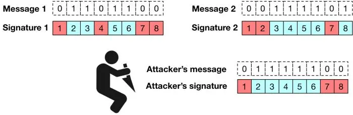 举例来说,假设有个攻击者观察到一条已经被签名的消息,消息开头是“1111…”。现在攻击者想要在不破坏签名的情况下,将消息编辑成“0000…”,只需要删掉这条签名中的几个组成部分即可!简言之,虽然要将 0 位元“翻转” 成 1 位元很困难,但反之要将 1 换成 0 就非常简单了。