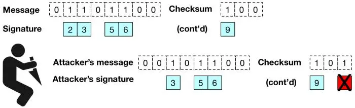 当然,机智的攻击者可能还会试图混淆校验和(校验和也和消息一起被签名),增加校验和的整数值来匹配她篡改的位元数。然而最关键的是,因为校验和是二进制整数,如果要增加校验和的值,攻击者势必得将一些 0 位元转换成 1 位元。又因为校验和也被签过名,这种签名方法从源头阻止这种转换(将 0 换成 1),因此攻击者无法得逞。