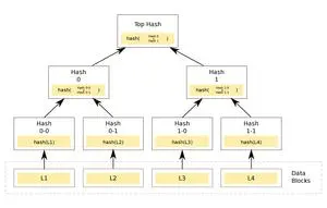 关于 Merkle tree 的更多描述请点击这里。概略地说,Merkle 方法提供了一种能收集不同的值,并用一个 “根” 哈希(例子中使用的哈希函数,长度为 256 bits)代表所收集的值的方法。给出这个根哈希,就能简单“证明” 某个元素存在于这个给出的哈希树。而且这个证明的大小和叶节点数量成对数关系。