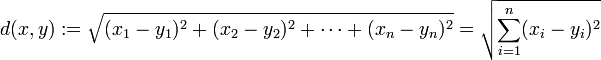 欧几里得距离是欧几里得空间中两点间的普通距离,即两点组成的直线的距离。其计算公式可以说是数学里的基本公式,如下,其基本含义就是计算两个点之间的空间距离。