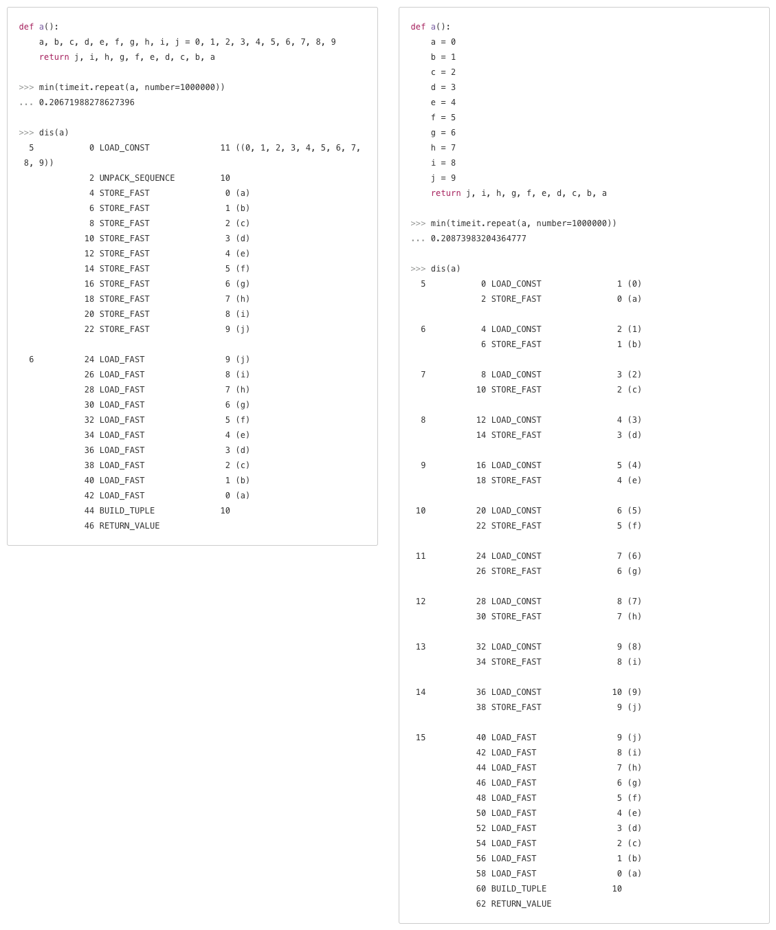 - 说明:Python中初始化集合类型时使用字面量的方式,解释器会直接调用BUILD_MAP等字节码来创建,如果用构造函数的方式来创建,则需要先查询构造方法,再执行构造方法。使用字面量初始化,Python代码也更简洁。