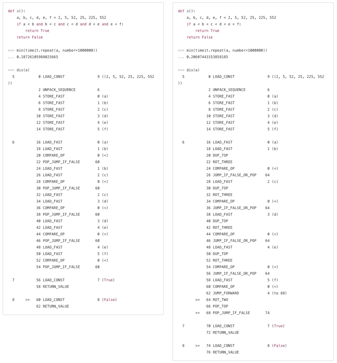 - 说明:使用第一种方法能带来一定的性能提升,但是提升有限,在实际情况中也很少出现多个变量连续比较大小的情况,并且第一种方法非常不Pythonic,所以推荐使用第二种。