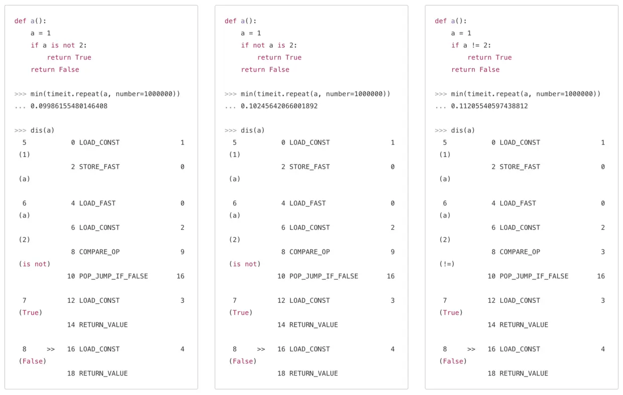 - 说明:从字节码上看,第一种方法的性能最高,语法角度上,if not写成第二种和第三种都是不推荐的。
