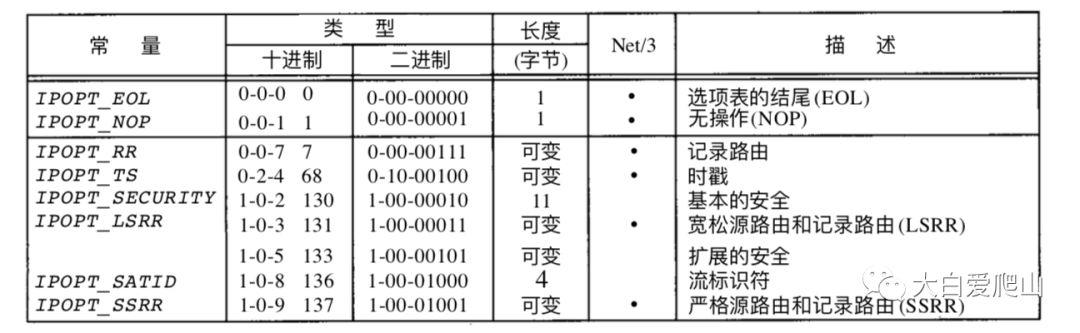 第1列显示了Net/3的选项常量,第2列和第3列是该类型的十进制和二进制值,第4列是选项的长度。Net/3列显示的是在Net/3中由ip_dooptions实现的选项。IP必须自动忽略所有它不识别的选项。