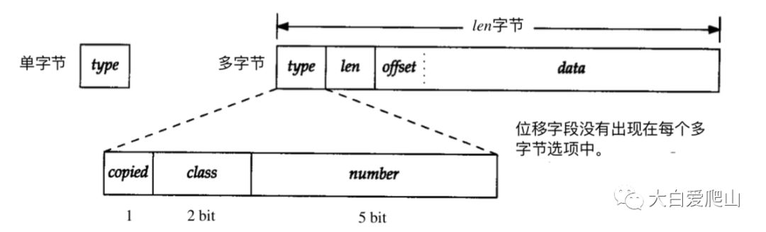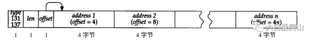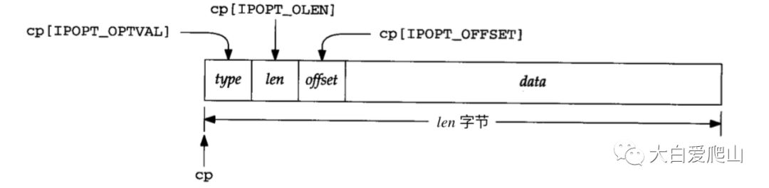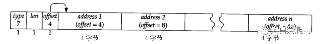 位移(offset)的值是某个字节在该选项内的序号(从type开始,序号为1),所以位移的最小值是4(IPOPT_MINOFF),它指向的是多字节选项中数据字段的第一个字节。
