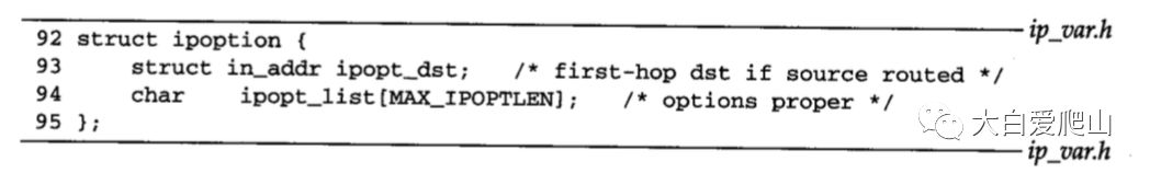 92~95 该结构只有两个成员:ipopt_dst,如果选项表中有源路由,则其中有第一跳目的地,ipopt_list,是一个最多拥有40(MAX_IPOPTLEN)字节的选项矩阵,其格式我们在本章中已做了描述。如果选项表中没有源路由,则ipopt_dst全为0。