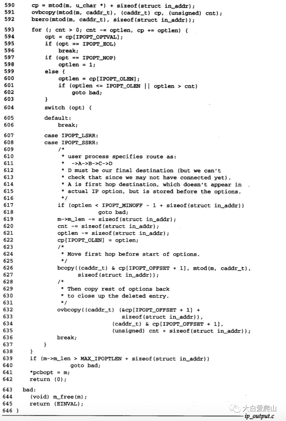 639~646 循环结束后,选项表的大小(包括第一跳地址)必须不能超过44字节(MAX_IPOPTLEN+4)。更长的选项表无法放入IP分组的首部。该表被保存在*pcbopt中,函数返回。