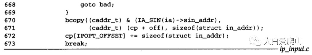 658~673 如果ip_dst是某个系统地址(分组已到达目的地),则把接收接口的地址记录在选项中,否则把ip_rtaddr提供的外出接口地址记录下来。把位移更新为选项中下一个可用地址位置。如果ip_rtaddr无法找到目的地的路由,就发送一个ICMP主机不可达差错报文。
