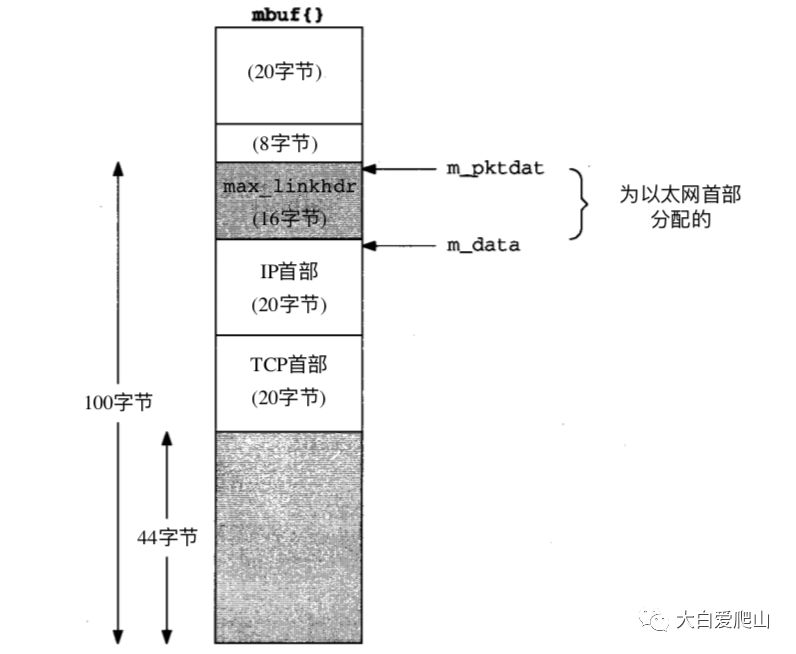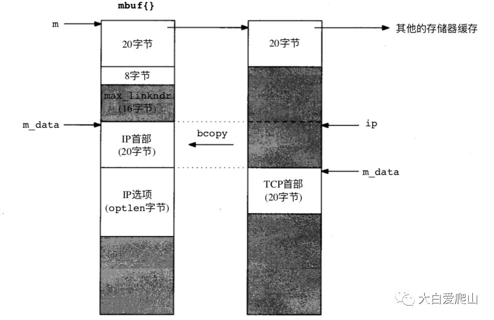 如果被插入的选项占据了多于16字节,则第367行的测试为真,并调用MGETHDR分配另一个mbuf。图28显示了选项被复制到新的mbuf后,该缓存的结构。