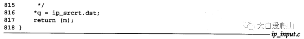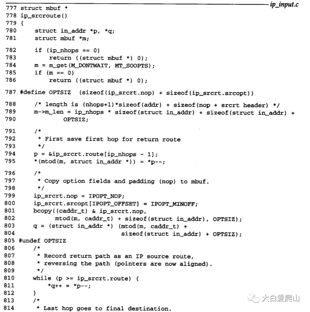 777~783 ip_srcroute把保存在ip_srcrt结构中的源路由逆转后,返回与ipoption结构(图24)格式类似的结果。如果ip_nhops是0,则没有保存的路由,所以ip_srcroute返回一个空指针。