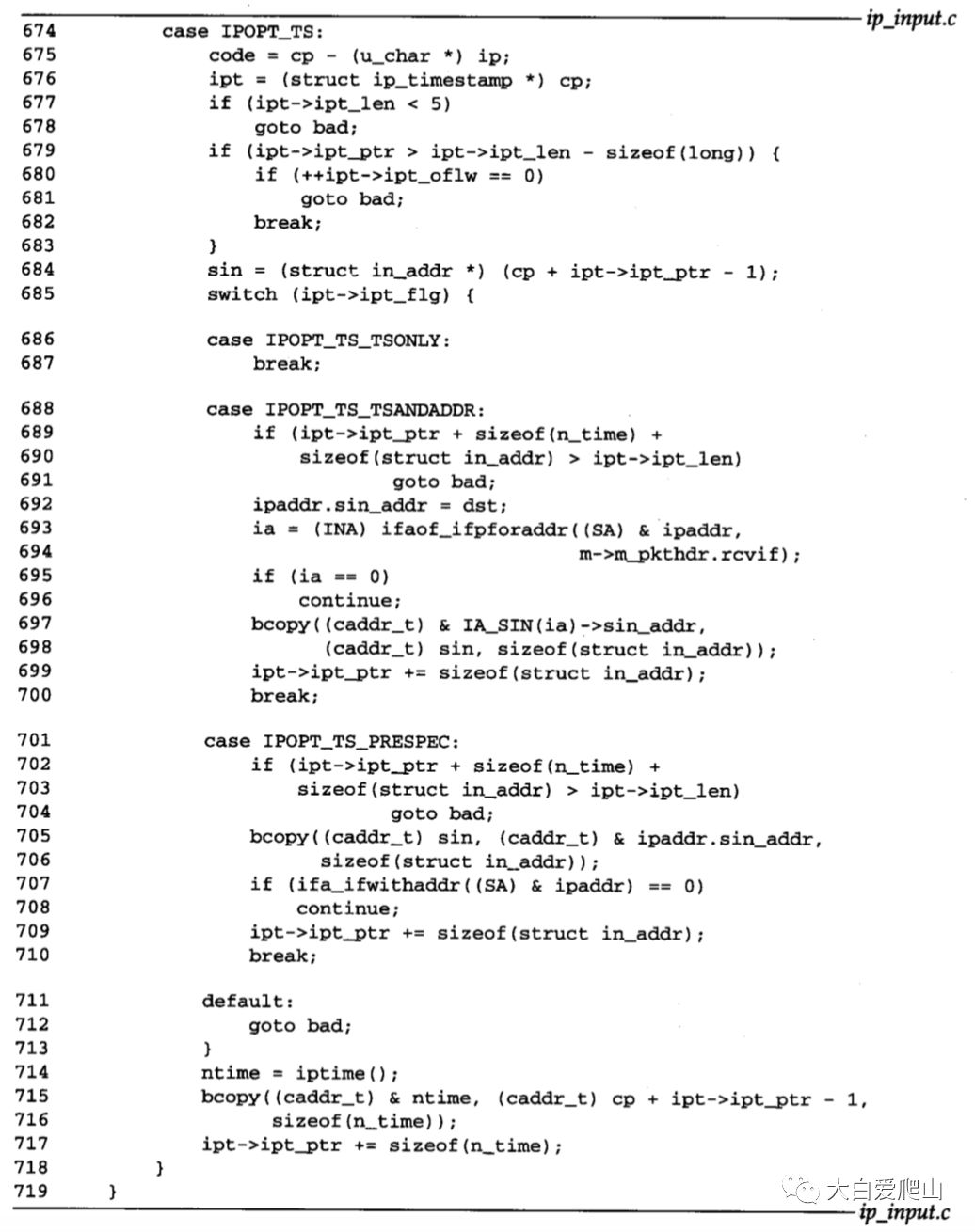 714~719 时间戳用switch语句后面的代码写入选项中。iptime返回自UTC午夜起到现在的毫秒数,ip_dooptions记录此时间戳,并增加此选项相对于下一个位置的偏移。