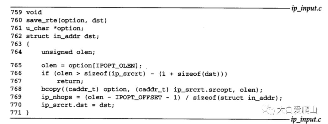 759~771 当一个源路由选择的分组到达目的地时,ip_dooptions调用save_rte。option是一个指向分组源路由选项的指针,dst是从分组首部来的ip_src(也就是,返回路由的目的地)。如果选项长度超过ip_srcrt结构,save_rte立即返回。实际上,这种情况永远不会发生,因为ip_srcrt结构比最大选项长度(40字节)要大。