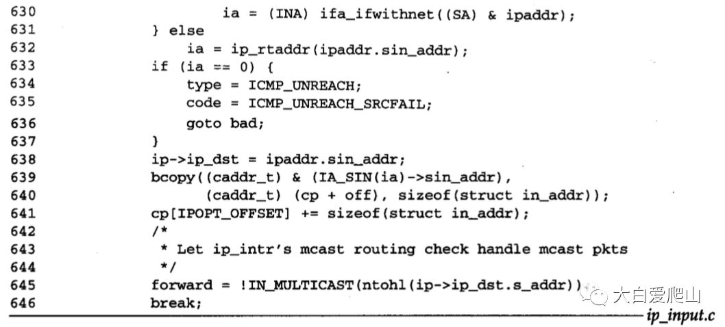 645~646 如果新的目的地址不是多播地址,就将forward设置成1,表明在处理完所有选项后,应该把分组转发而不是返回给ipintr。