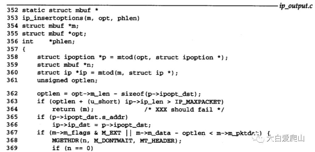 352~364 ip_insertoptions有三个参数:m,外出的分组;opt,在结构中格式化的选项;phlen,一个指向整数的指针,在这里返回新首部的长度(在插入之后)。如果插入选项分组长度超过最大分组长度65535字节,则自动将选项丢弃。ip_dooptions认为ip_insertoptions永远都不会失败,所以无法报告差错。幸好很少有应用程序会试图发送最大长度的数据报。