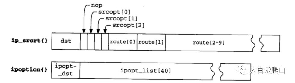 结构ip_srcrt比ipoption多4个字节。路由矩阵的最后一个入口(route[9])永远都不会填上,因为这样的话,源路由选项将会有44字节,比IP首部所能容纳的要大。