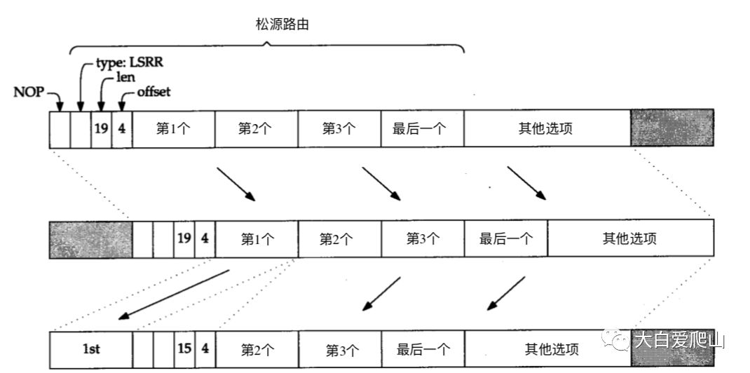 p被初始化为指向到达路由的末尾,ip_srcroute把最后记录的地址复制到mbuf前面,在这里这为外出的第一跳目的地开始逆转后的路由。然后该函数把一份NOP选项源路由信息复制到mbuf中。