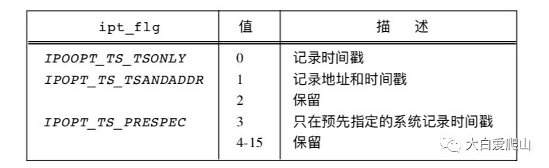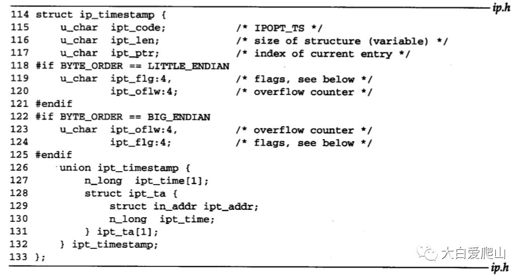 114~133 如同ip结构一样,#ifs保证比特字段访问选项中正确的比特位。图19列出了由ipt_flg指定的三种时间戳选项类型。
