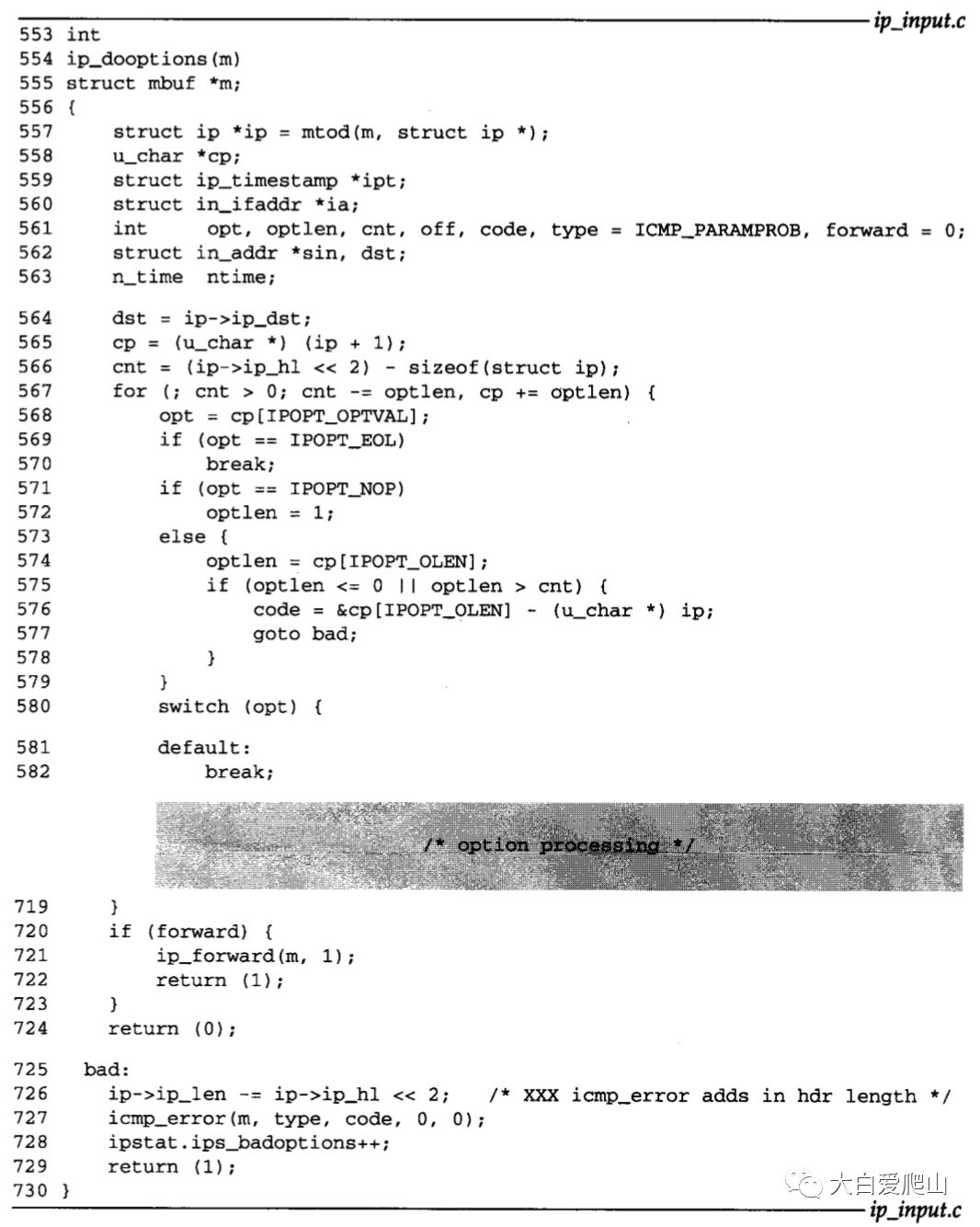 555~582 for循环按照每个选项在分组中出现的顺序分别对它们进行处理。EOL选项以及一个无效的选项长度都将终止该循环。当出现NOP选项时,忽略它。switch语句的default情况要求系统忽略未知的选项。