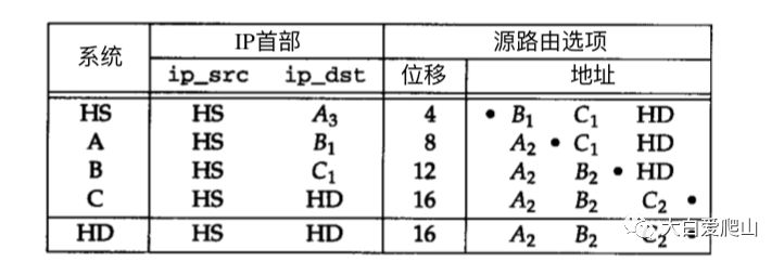 IP首部的源和目的地址以及在选项中列出的位移和地址表,指定了路由以及分组目前在该路由中所处的位置。图12显示,当分组按照这个宽松源路由从HS经过A、B、C到HD时,信息是如何改变的。每行代表当分组被第1列显示的系统发送时的状态。最后一行显示分组被HD接收。图13显示了相关代码。