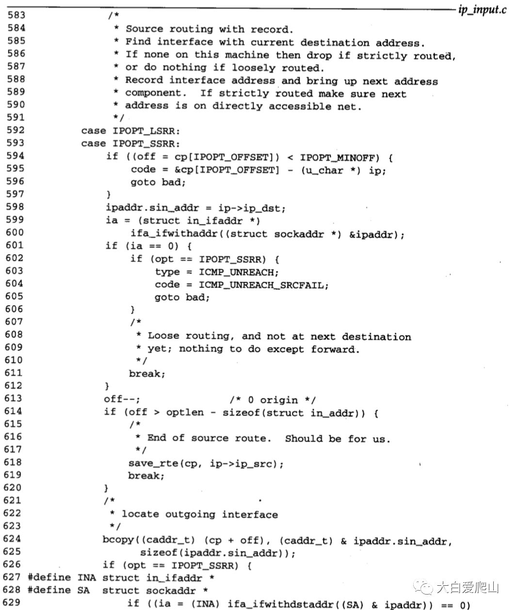 583~612 如果选项位移小于4,即IPOPT_MINOFF,则Net/3发送一个ICMP参数差错,并带上相应的code值。如果分组的目的地址与本地地址没有一个匹配,且选项是严格源路由(IPOPT_SSRR),则发送一个源路由失败差错。如果本地地址不在路由中,则上一个系统把分组发送到错误的主机上了。对宽松路由(IPOPT_LSRR)来说,这不是错误;仅意味着IP必须把分组转发到目的地。