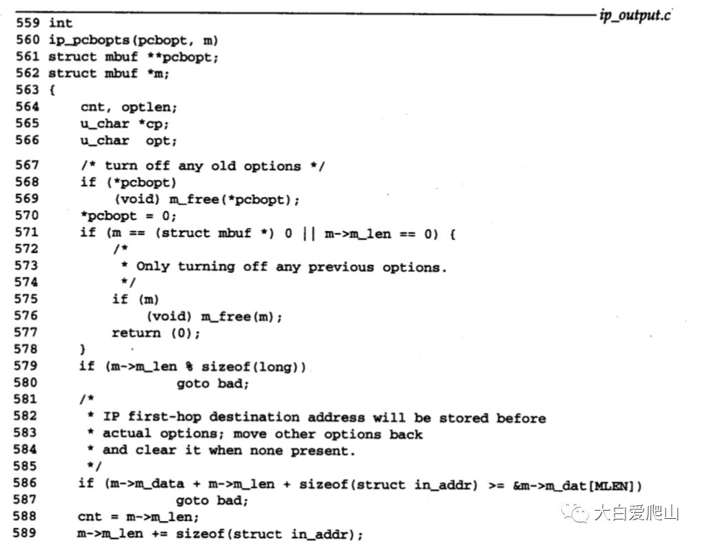 559~562 第一个参数,pcbopt引用指向当前选项表的指针。然后该函数用一个指向新选项表的指针来代替该指针,这个新选项表是由第二个参数m指向的缓存链所指定的选项构造而来。该过程所准备的选项表,将被包含在IP_OPTIONS插口选项中,除了LSRR和SSRR选项的格式外,看起来像一个标准的IP选项表。对这些选项,第一跳目的地址作为路由的第一个地址出现的。图12中,在外出的分组中,第一跳目的地址是作为目的地址出现的,而不是路由的第一个地址。