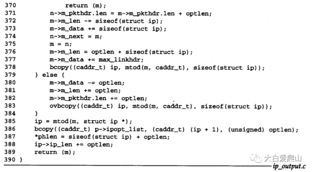 379~384 如果分组在缓存数据区的开始部分有存放选项的空间,则修改m_data和m_len,以包含optlen更多的字节。并且当前的IP首部被ovbcopy移走,为选项腾出位置。