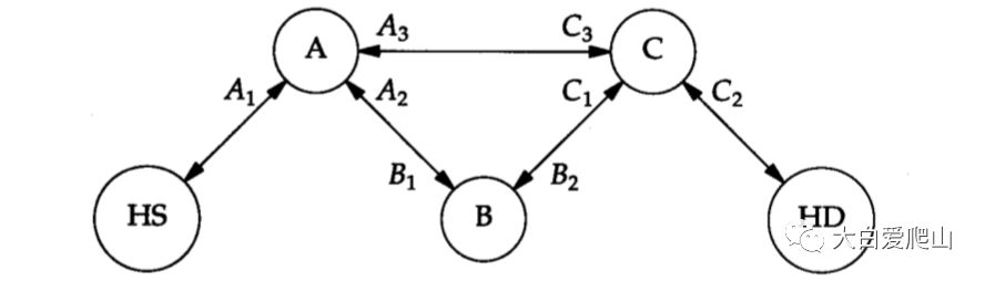 A、B和C是路由器,HS和HD是源和目的主机。因为每个接口都有自己的IP地址,所以我们看到路由器A有三个地址:A1、A2和A3。同样,路由器B和C也有多个地址。图11显示了源站和记录路由选项的格式。