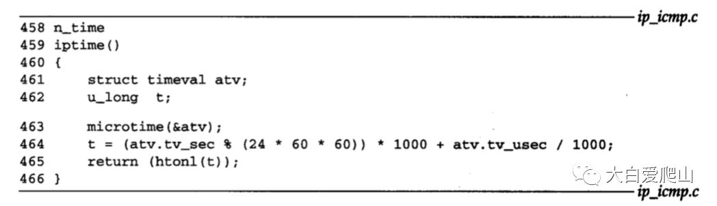 458~466 microtime返回从UTC1970年1月1号午夜以来的时间,放在timeval结构中。从午夜以来的毫秒用atv计算,并以网络字节返回。
