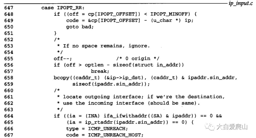 647~657 如果位移选项太小,则ip_dooptions就发送一个ICMP参数问题差错。如果变量code被设置成分组内无效选项的字节位移量,并且bad标号语句的执行产生错误,则发出的ICMP参数问题差错报文中就具有该code值。如果选项中没有附加地址空间,则忽略该选项,并继续处理下一个选项。