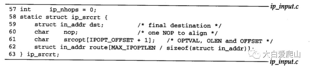 57~63 该代码定义了ip_srcrt结构,并声明了静态变量ip_srcrt。只有两个函数访问ip_srcrt:save_rte,把到达分组的源路由复制到ip_srcrt中;ip_srcroute,创建一个与源路方向相逆的路由。图15说明了源路由处理过程。