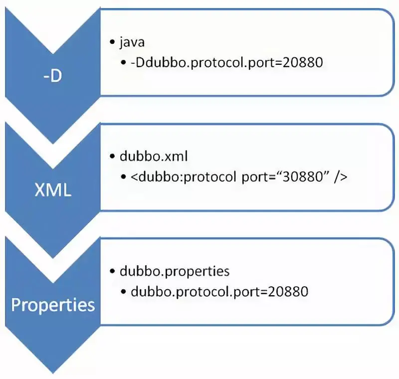 Properties 最后,相当于缺省值,只有 XML 没有配置时,dubbo.properties 的相应配置项才会生效,通常用于共享公共配置,比如应用名。