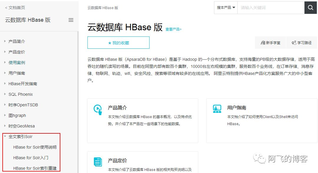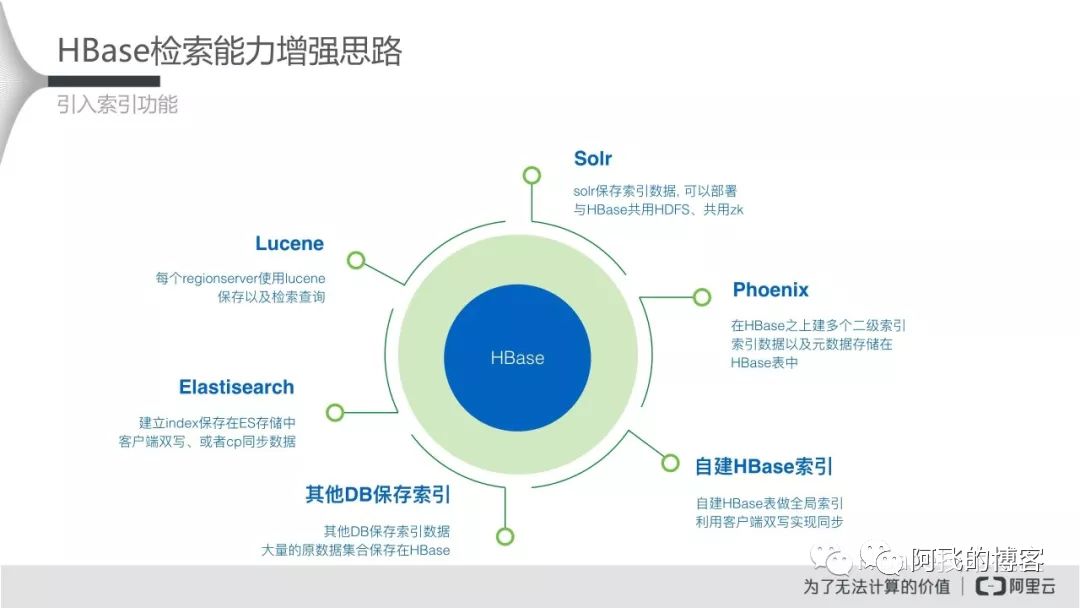 阿里云上的云数据库HBase版也是借助solr实现全文索引,有兴趣的同学可以戳链接了解更多:https://help.aliyun.com/product/49055.html?spm=5176.124785.631202.con1.603452c0cz7bj2。